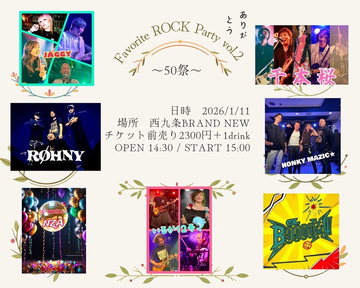 カオリンさん誕生日イベントにBOØWYと山下久美子のコピバン HØNKY MAZICと L'Arc~en~Cielコピバン 千本桜で出演します🎶 最高の1日にしましょう💪 Favorite ROCK Party vol.2〜50祭〜 日時 2026/1/11(日) 場所 西九条BRAND NEW チケット前売り2300円+1drink OPEN 14:30 / START 15:00 pic.x.com/1EKI9SvfT8