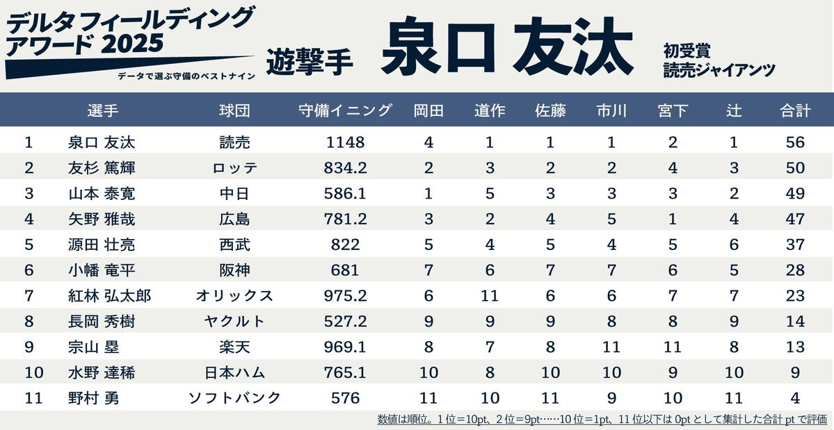 【遊撃手部門】データで選ぶ守備のベストナイン “デルタ・フィールディング・アワード2025”|1.02 1point02.jp/op/gnav/column… 1位 泉口友汰 2位 友杉篤輝 3位 山本泰寛 4位 矢野雅哉 5位 源田壮亮 6位 小幡竜平 7位 紅林弘太郎 8位 長岡秀樹 9位 宗山塁 10位 水野達稀 11位 野村勇