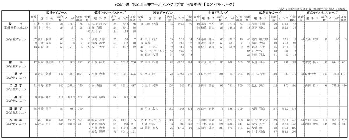 2025年度『第54回 三井ゴールデン・グラブ賞』有資格者が発表される!!! - ドラ要素@のもとけ dnomotoke.com/archives/20251… #dragons #中日ドラゴンズ ▼2025年度 第54回三井ゴールデン・グラブ賞 有資格者 【セントラル・リーグ】