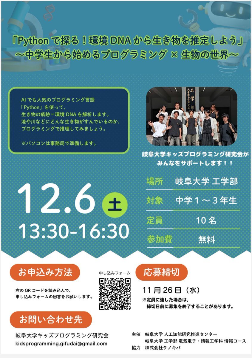 12/6(土)13:30〜16:30に、中学生向けのイベント 「Pythonで探る!環境 DNAから生き物を推定しよう」 ~中学生から始めるプログラミング×生物の世界~ が岐阜大学にて行われます。応募〆切は11/26(水)です。 東海地方にお住まいで、ご興味のある方はぜひ! (自分もお手伝いとして参加します) pic.x.com/ibwS538GM5