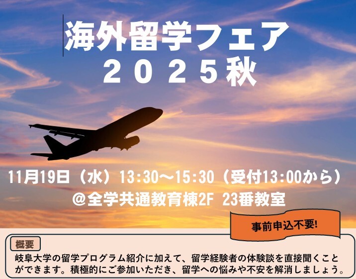 \岐阜大学生のみなさん/ 海外留学フェア2025秋のお知らせ✈️ アメリカ・カナダ・オーストラリアの短期研修や交換留学、トビタテ留学JAPANなど、 留学経験者の体験談は、海外を本気で考えている人だけでなく、少しでも興味がある人ならきっと何か持ち帰れます✨ 参加申込は不要です‼