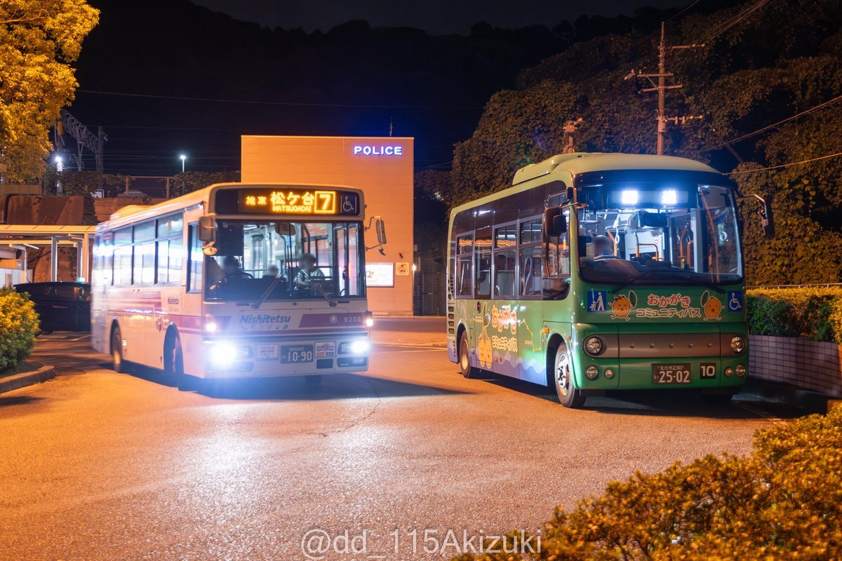 西鉄バスが発着する最終日の海老津発着所にて。かつては幹線を走る20番と海老津から延びる6番波津線の乗り換え拠点として賑わったであろう結節点。発着所周辺には商店街が形成され、乗降客も多かっただろうと想像します。岡垣町ふれあいバスと西鉄バスがバトンタッチするように離合してゆきました。 pic.x.com/Uod4ERShFA