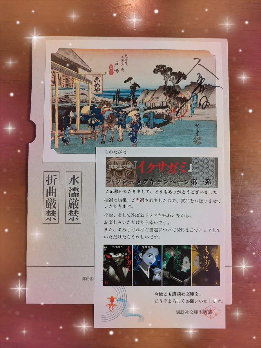 キャンペーン当選しました🎁ありがとうございます😂今村先生サイン入りポストカード 「戸塚」でした。大切にさせていただきます✨原作読み進めてますが、推しキャラは変わらず、嵯峨愁二郎さまです🥰💕Netflixドラマも待ち遠しいです💛 #イクサガミ推しキャラ #イクサガミ #今村翔吾 #岡田准一 pic.x.com/xN0TEFRKXn x.com/ikusagami_info…