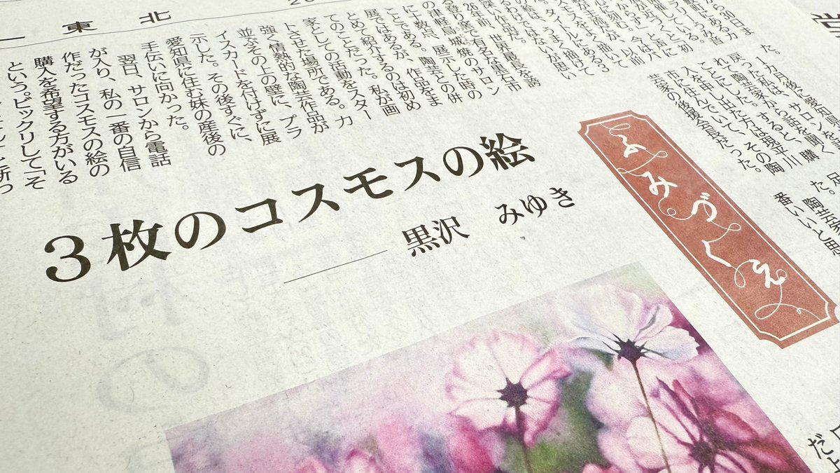 〈11月12日(水)付【文化面】〉 エッセー「ふみづくえ」は、黒沢みゆきさん。純粋な志を思い出させてくれるという3枚のコスモスの絵についてつづっています✍️ 他に、3人の女性作家の素顔に迫った「装いの翼 おしゃれと表現と」(岩波書店)の刊行を記念し、八戸市で開かれたトークイベントの話題も。 pic.x.com/8OxvGZrZBi