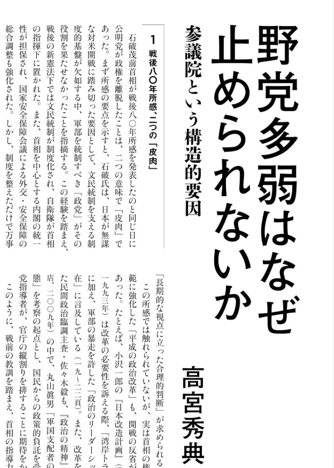 岩波書店『世界』2025年12月号(創刊1000号、おめでとうございます)に、高宮秀典先生が執筆された「野党多弱はなぜ止められないか――参議院という構造的要因」が掲載されています。ご著書、『参議院による多元的民意の反映』(小会刊行)とあわせてぜひご覧ください。 utp.or.jp/book/b10107513… x.com/WEB_SEKAI/stat…