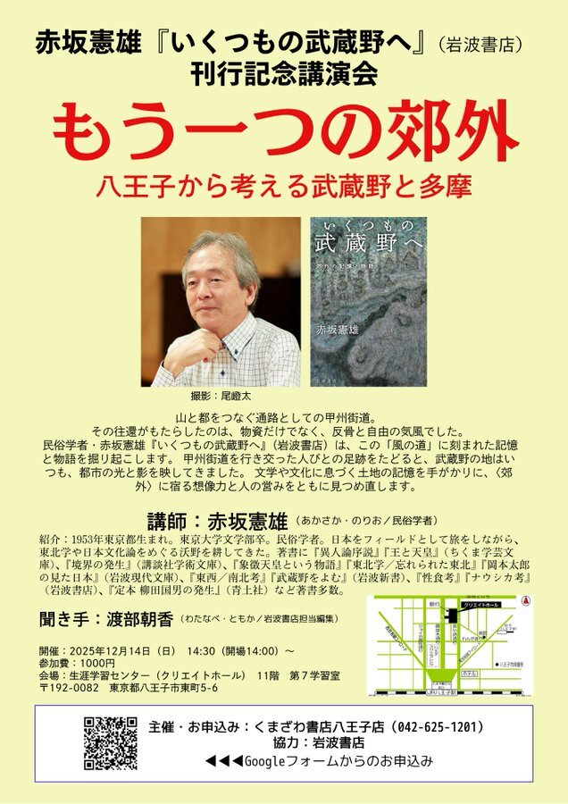 12月14日(日)14:30 ~  16:00 赤坂憲雄「もう一つの郊外 八王子から考える武蔵野と多摩」『いくつもの武蔵野』(岩波書店)刊行記念 1000円 生涯学習センター(クリエイトホール)11階 第7学習室 by くまざわ書店八王子店 docs.google.com/forms/d/e/1FAI… #s_info pic.x.com/iKRbmRdRL6