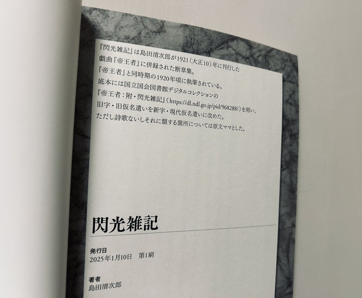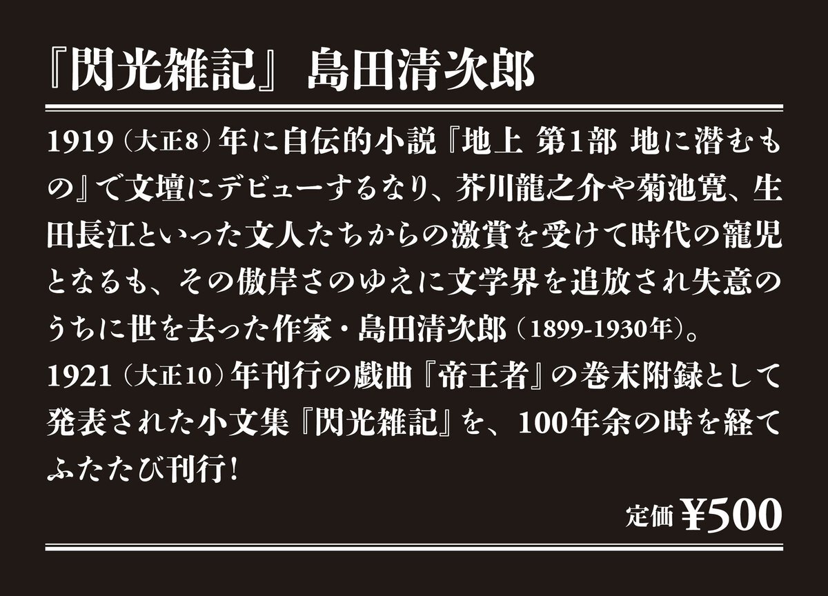 昨夜はスペースへのご参加ありがとうございました。録音を聞いていただいた方もおられるようでうれしいです。昨夜話せなかった冊子をご紹介します。 『閃光雑記』 島田清次郎/著 杏桃舎/編集・制作 今年1月に初売り。文豪アルケミストファンの方から熱い視線を受けました。 #文アル #文フリ pic.x.com/by0cU3LETE x.com/hiddakiko/stat…