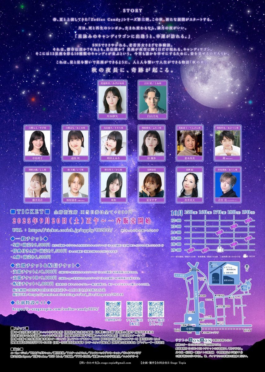 #秋星座キャンディ アフタートークイベント📣 17日(金)19時の回 登壇者 #川本紗矢 さん #白山力丸 さん #中島明子 さん MC #若宮亮 約15分ほどのトークイベントとなります🎙️🌠 裏話も是非🌌✨ ※配信では本編のみとなりますのでご了承ください🙇 🌌公演特設サイト🌌 e-stagetopia.com/zodiac-candy20… pic.x.com/U6TDdZDmgc x.com/topiastage/sta…