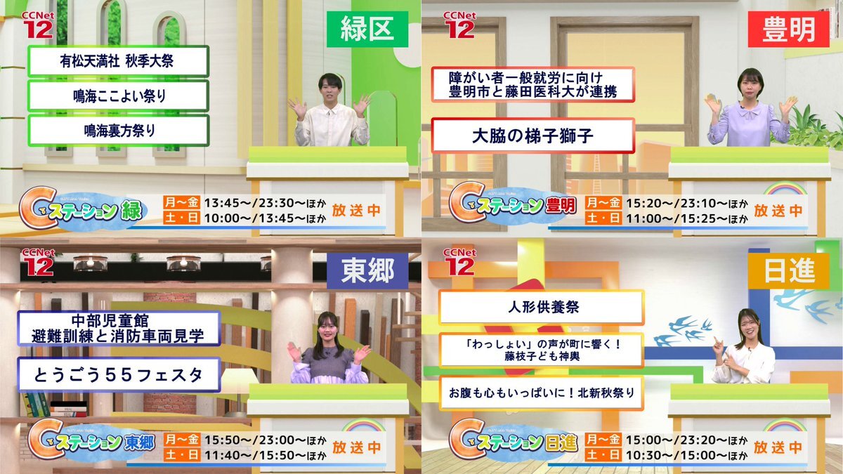 📍Cステーション 10/27~11/2の📺Cステーションは ご覧の内容でお送りしています💮 💚Cステーション緑  深見健登 🧡Cステーション日進 樋田有紗 ❤️Cステーション豊明 加古笙子 💙Cステーション東郷 波多野成美 ぜひCCNet12をご覧ください👏 #名古屋市緑区 #豊明市 #日進市 #東郷町 pic.x.com/1zr1afi8CW