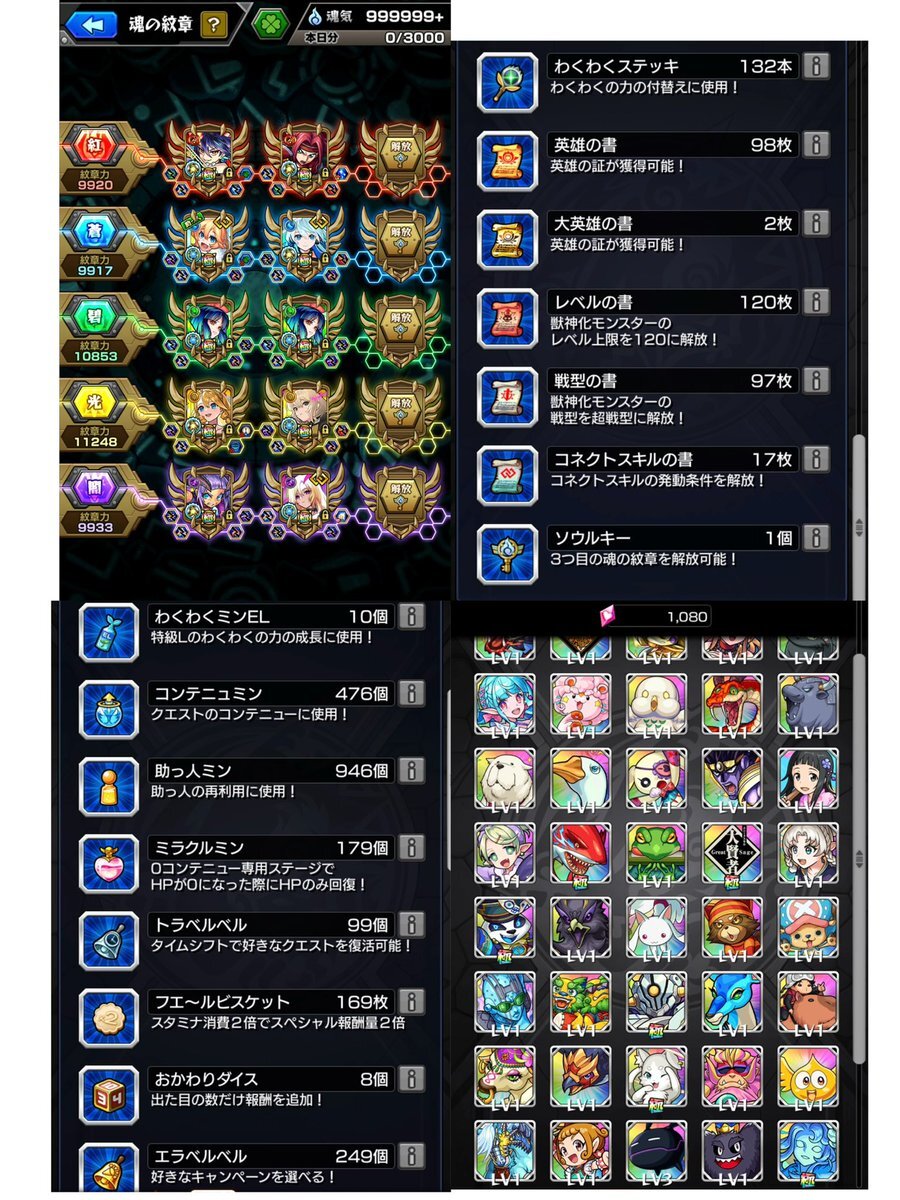 モンスト垢 •ゼーレ運極 •ガチャ限★6:1489体 •限定★6:215体 •コラボ★6:163体 •運極数:655体 •魂気:999999+紋章全属性対応 •守護獣の欠片:1080 •わくわくステッキ132本 •英雄の書9枚 / 大英雄の書2枚 •戦型の書97枚 / レベルの書120枚 •#モンストアカウント#モンスト引退 pic.x.com/bBIm9j9m9w