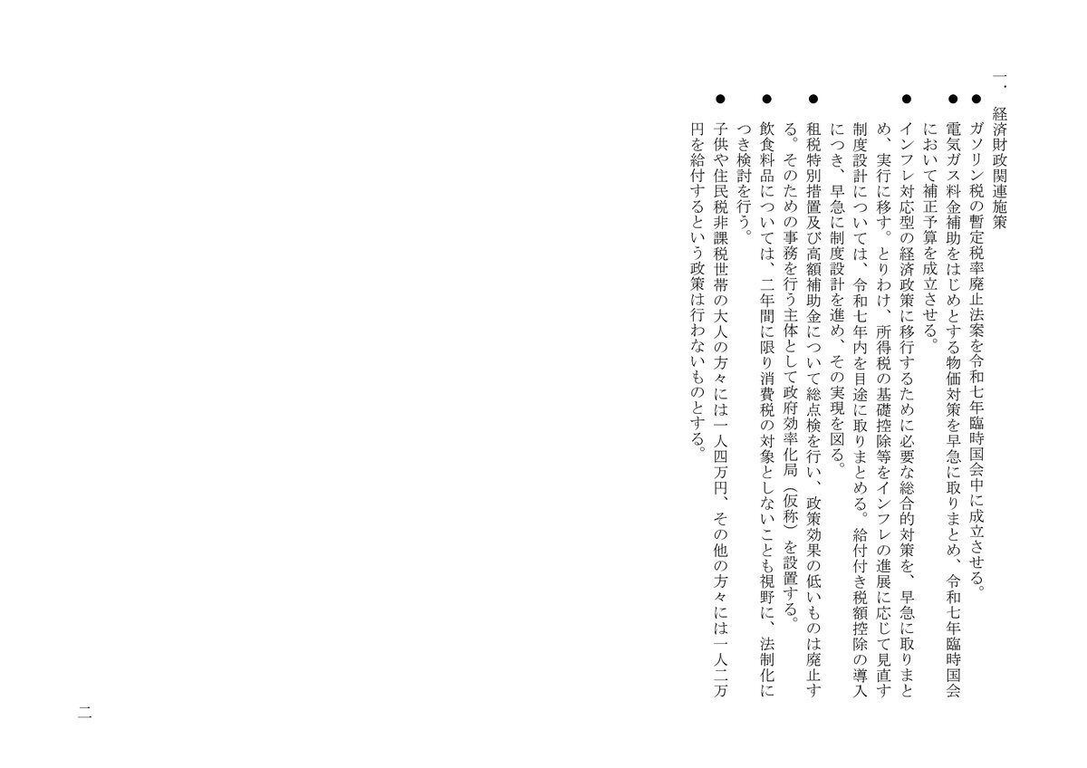ガソリン税の旧暫定税率を廃止 電気・ガス料金補助などの物価対策と補正予算を早急に実施 インフレ対応型経済政策へ転換し、所得税の基礎控除や給付付き税額控除を見直す 政府効率化局(仮称)を設立して、租税特別措置や高額補助金を総点検 飲食料品の2年間非課税化も検討 現金給付は実施しない ⸻ x.com/nikkei/status/…