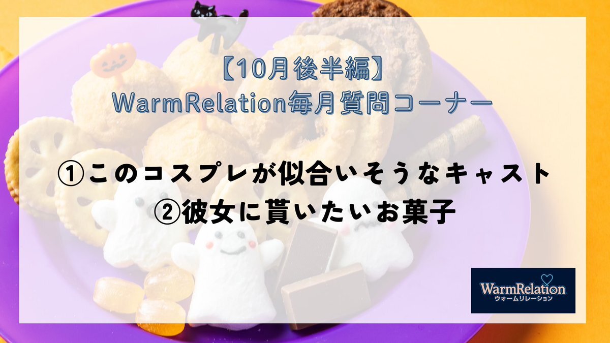 ◤#WarmRelation毎月質問コーナー◢ 毎月様々なテーマでキャストに質問していくコーナーです🎤 10月後半のテーマは… ① #このコスプレが似合いそうなキャスト ② #彼女に貰いたいお菓子 引用ポストで 彼氏たちの回答をぜひご覧ください🎃✨ #レンタル彼氏 #レンタル彼氏質問コーナー