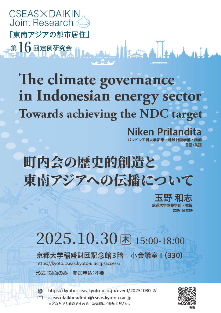 ◤研究会のお知らせ◢ 「東南アジアの都市居住」第16回定例研究会では、バンドン工科大学よりNiken Prilandita講師、放送大学より玉野和志教授をお迎えしてお話しを伺います。事前申込不要。どなたでもご参加いただけます。 🗓️10月30日(木)15–18時 📍京都大学稲盛財団記念館 kyoto.cseas.kyoto-u.ac.jp/event/20251030… pic.x.com/Z8XgIqCkGA
