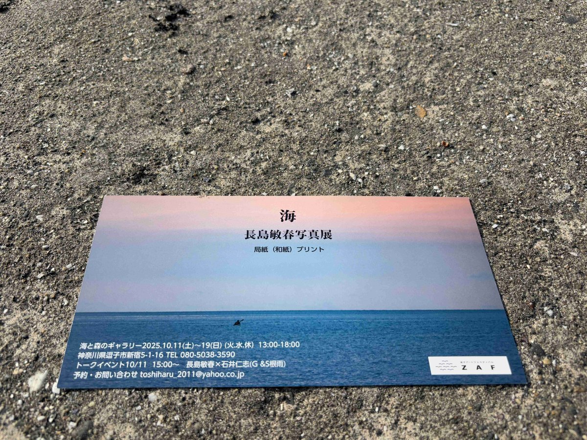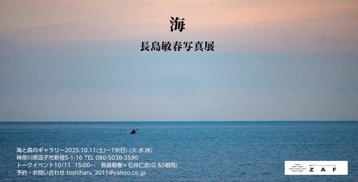 #逗子アートフェスティバル2025 自由企画のご案内✨ 🖼️「海」長島敏春写真展 局紙(和紙)プリント 🧑🎨長島敏春 🗓️10/11(土)〜19(日)13:00〜18:00 ⚠️休廊日:水曜・木曜 👛無料 📍海と森のギャラリー(新宿5-1-16) zushi-art.com/2025/arts/26 #ZAF2025 pic.x.com/hzDHQ6ulJe