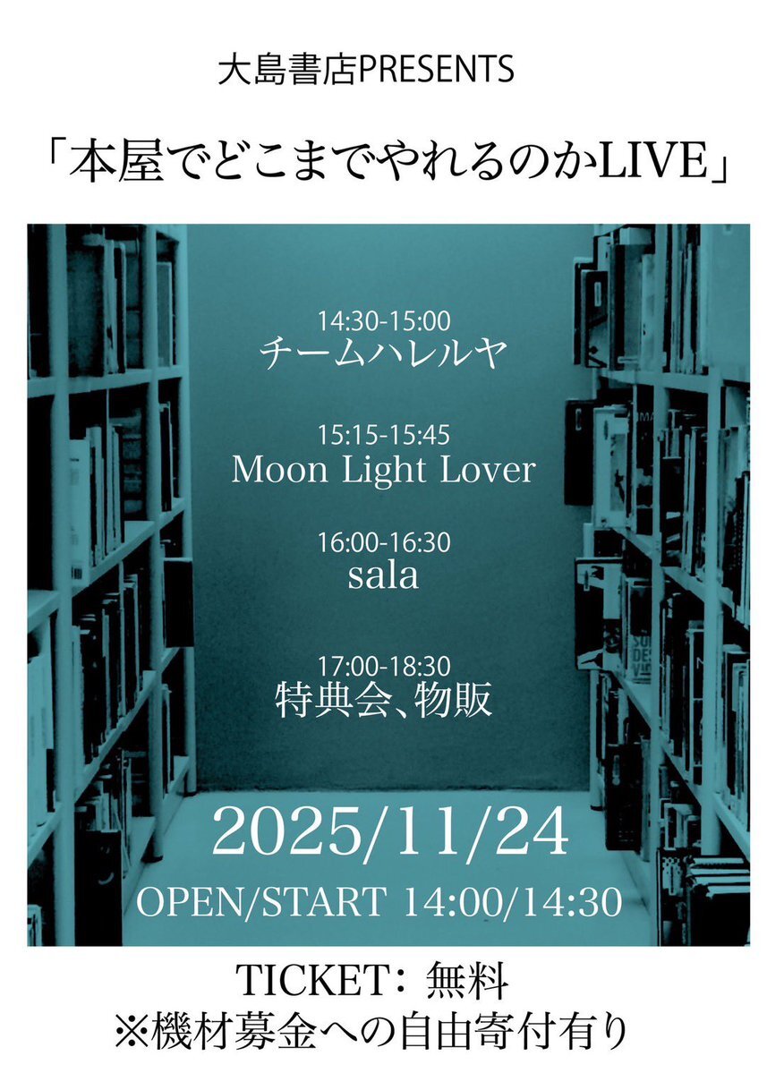 茨城県日立市ご当地アイドル チームハレルヤ 4days 4日目は 11/24(月祝) 14:30〜 本屋でどこまでやれるかLIVE 大島書店 日立市鹿島町1丁目11−17 周りにコインパーキング沢山あります ヒタチエから歩いて10分かからないくらいです その後は同所にて 15:15〜Moon Light Lover 16:00〜sala pic.x.com/t2C2HZu8Zg x.com/team_hallelu_y…
