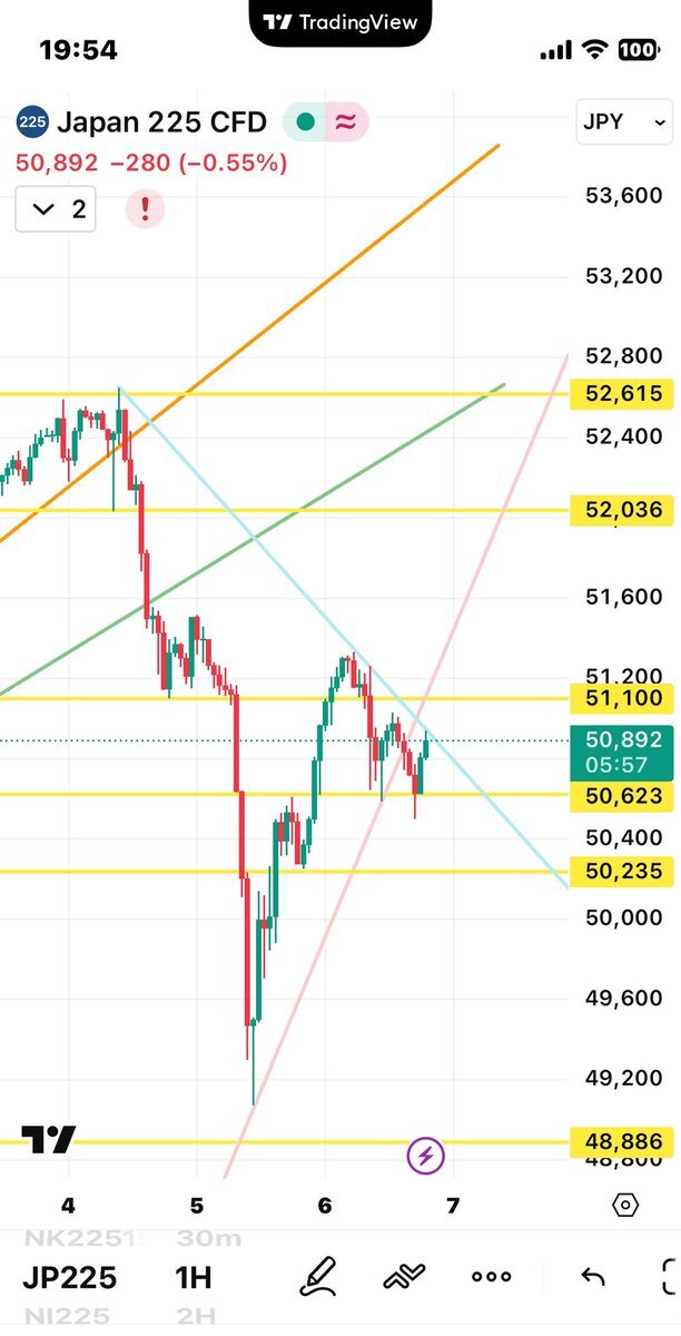 日経CFD📊1時間足 水色🩵下降トレンドラインまだ⬆️に抜けてないです👀 20:00になると 🩵下降トレンドラインは50950円になるので、そこを明確にに⬆️に抜けたらロスカットです☹️ x.com/sakura_a1116/s…
