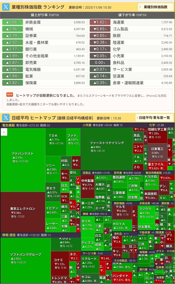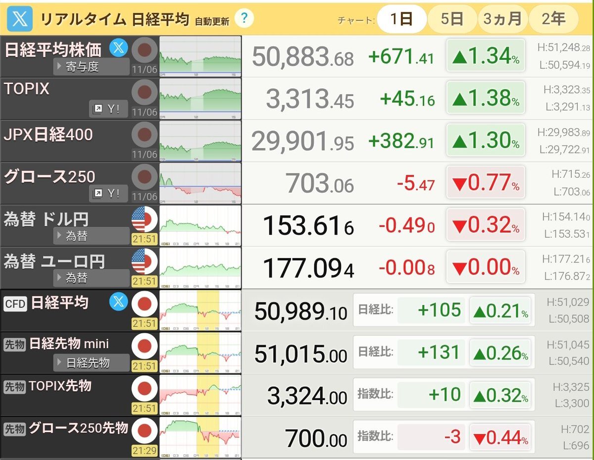 皆さん本日もお疲れ様でした😌 令和7年11月6日木曜日、日本株市場。日経平均は反発😉 前日の米国株市場の上昇を受け主力株メインで買われました。 グロース250指数は三日続落、金利上昇が重荷で新興株の下落につながったとのこと🤔 ドル円は153円半ば。日経平均先物は若干の上昇、50,900円台です。 pic.x.com/yqSbTFODwO