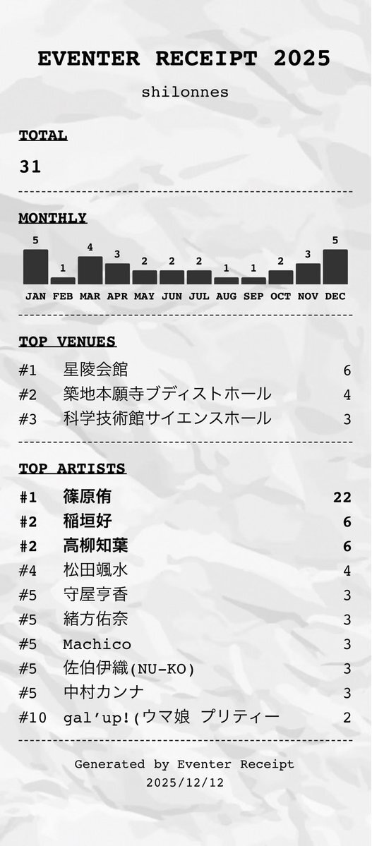 今年一番行った会場は〜? 2025年は星稜会館が優勝です。 ありがとうございました。 🧾 My Eventer Receipt 🔗 receipt.gyuni.space #EventerReceipt #イベノレシート pic.x.com/DI9sFeRPrf