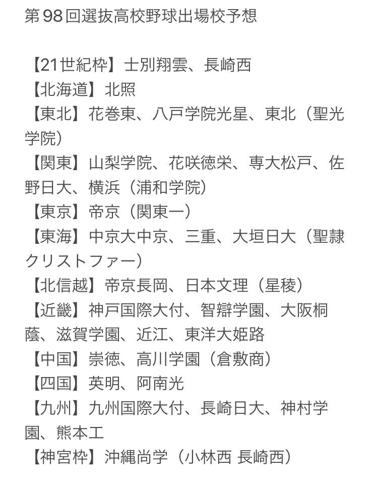 第98回選抜高校野球出場校予想 【北信越】帝京長岡、日本文理(星稜) 【近畿】神戸国際大付、智辯学園、大阪桐蔭、滋賀学園、近江、東洋大姫路 【中国】崇徳、高川学園(倉敷商) 【四国】英明、阿南光 【九州】九州国際大付、長崎日大、神村学園、熊本工 【神宮枠】沖縄尚学(小林西 長崎西) pic.x.com/fvb01w8xaC