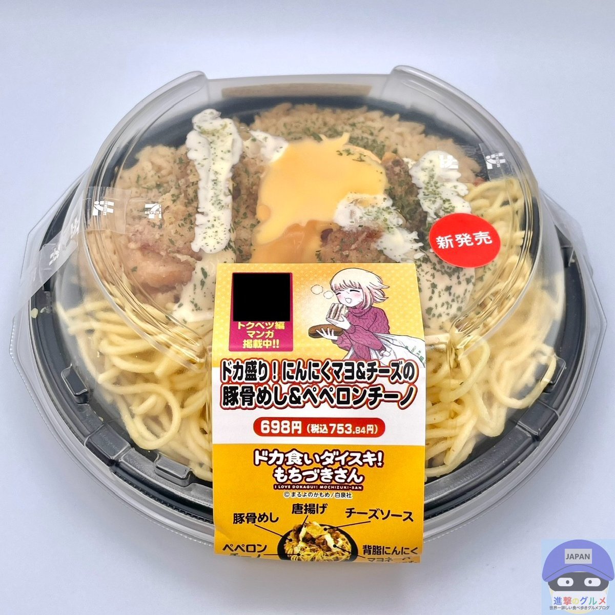 「ドカ盛り!にんにくマヨ&チーズの豚骨めし&ペペロンチーノ(753円)」 2025年11月18日発売、セブンイレブンの新商品。 人気グルメ漫画「ドカ食いダイスキ!もちづきさん」とのコラボ、背徳メシのコンビニ弁当です。 豚骨めし、唐揚げ2個、ペペロンチーノ、チーズソース、背脂にんにくマヨネーズ。