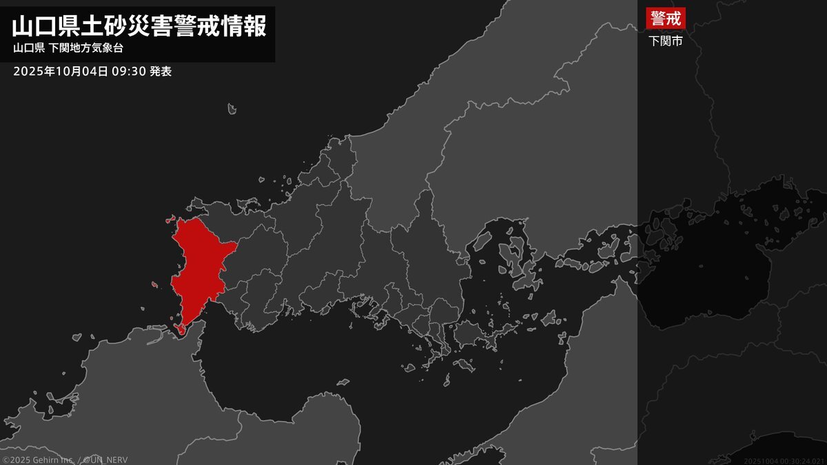 【山口県 土砂災害警戒情報 2025年10月04日 09:30】 山口県の警戒対象地域では土砂災害の危険度が高まっています。身の安全を確保するよう努めてください。