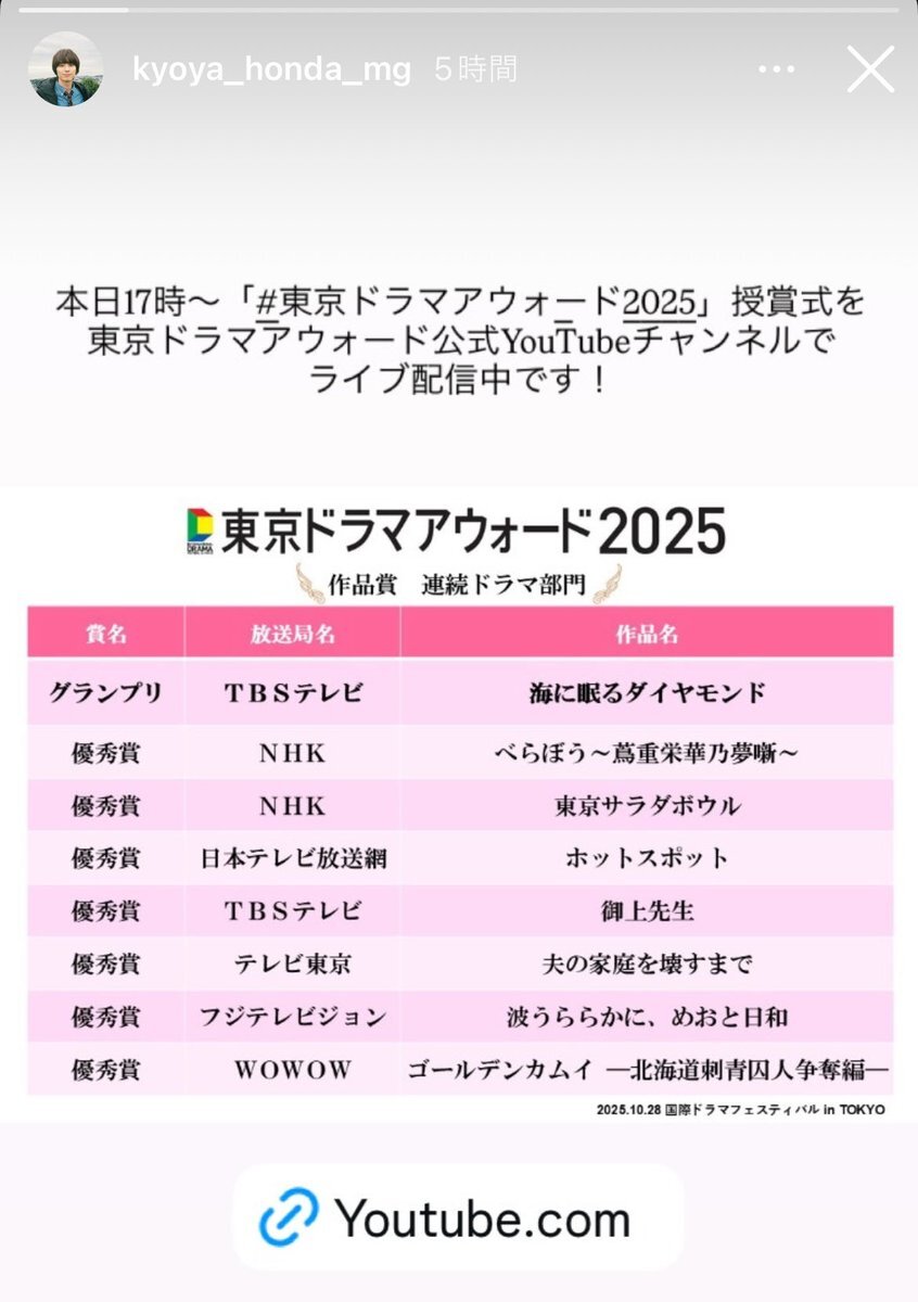 マネージャーさんオフショありがとうございます🥺💕 チームめおと日和の皆様🩷響矢くん🩷 改めて連続ドラマ部門優秀賞受賞おめでとうございます㊗️🎉㊗️ めおと日和また見返します❤️ ほんとに大切な作品に出逢えて幸せです☺️💕 #本田響矢 instagram.com/p/DQWxUVGicUH/…