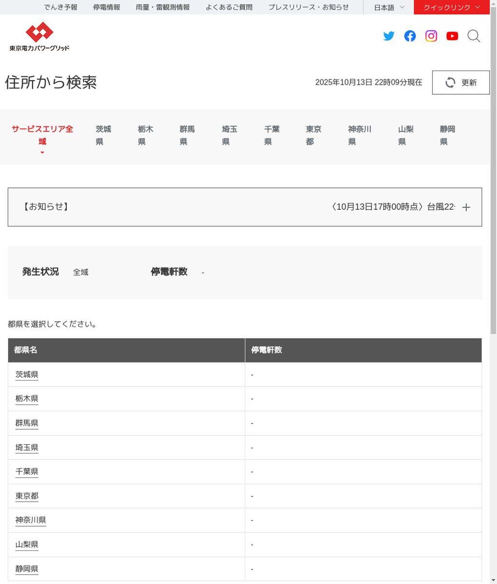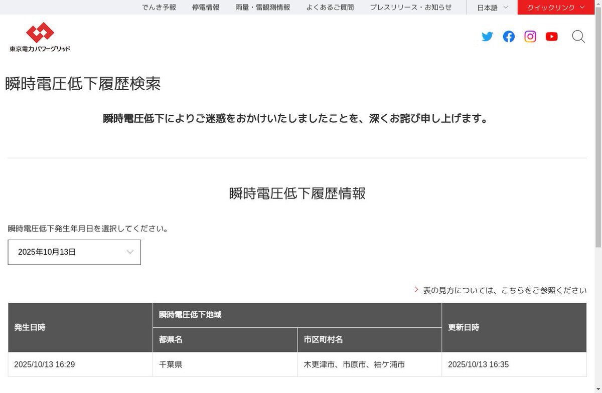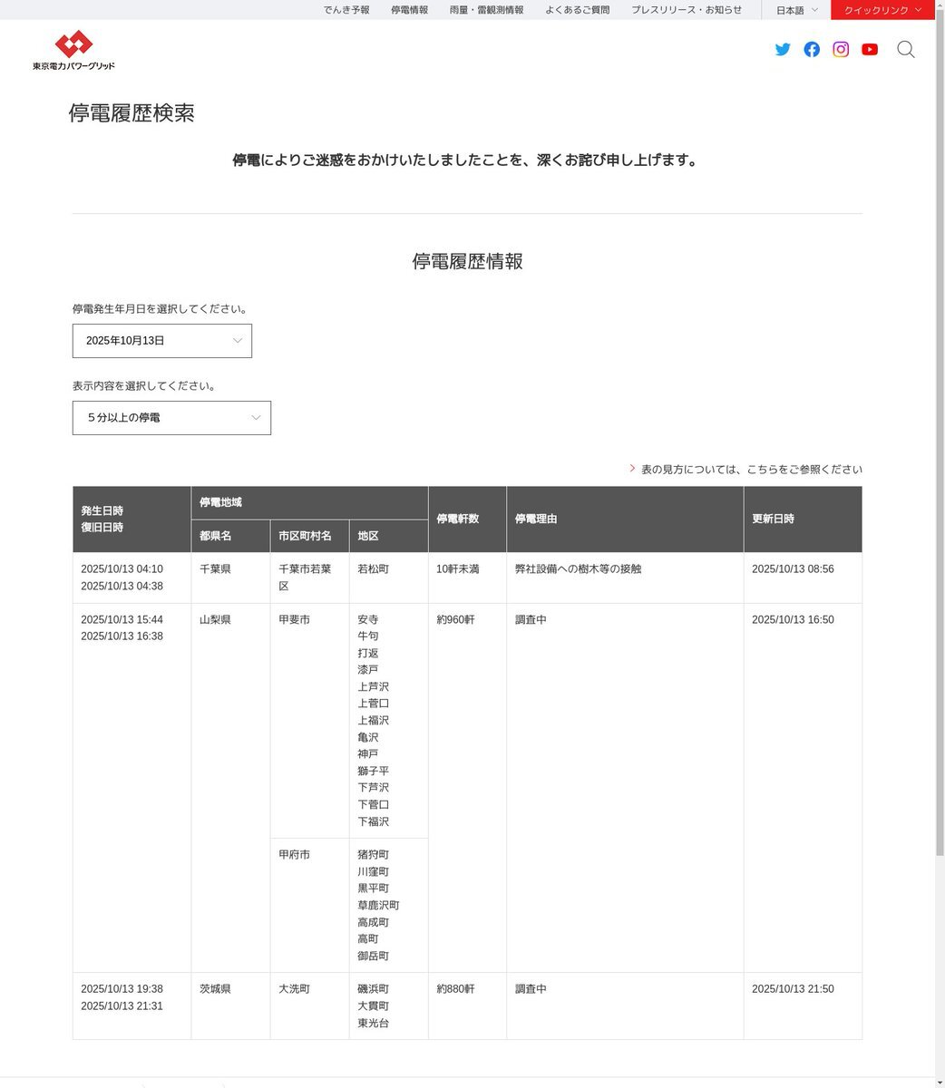 [東京電力:停電] 2025-10-13 [5分以上の停電] 千葉, 山梨, 茨城 [5分未満の停電] 埼玉 teideninfo.tepco.co.jp/day/teiden/ind… pic.x.com/36vxxarRQt