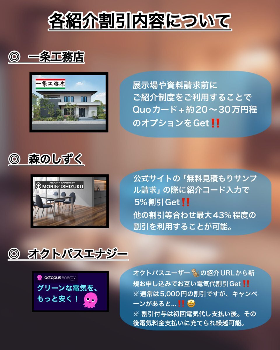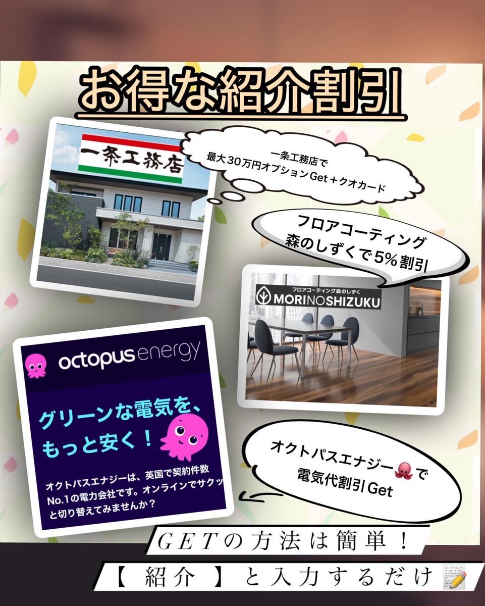 一条工務店 & フロアコーティング の 森のしずく & オクトパスエナジー の紹介とご連絡下さい。 詳細はInstagram👉instagram.com/p/DGc5CMjTXop/… 🐙オクトパス紹介🐙 octopusenergy.co.jp/friend/green-b… looopでんき,楽天でんき,東京ガス,東京電力,タダ電等電力会社切替時に紹介利用で電気代8000円割引付与🈹 pic.x.com/bgRnLHsHca