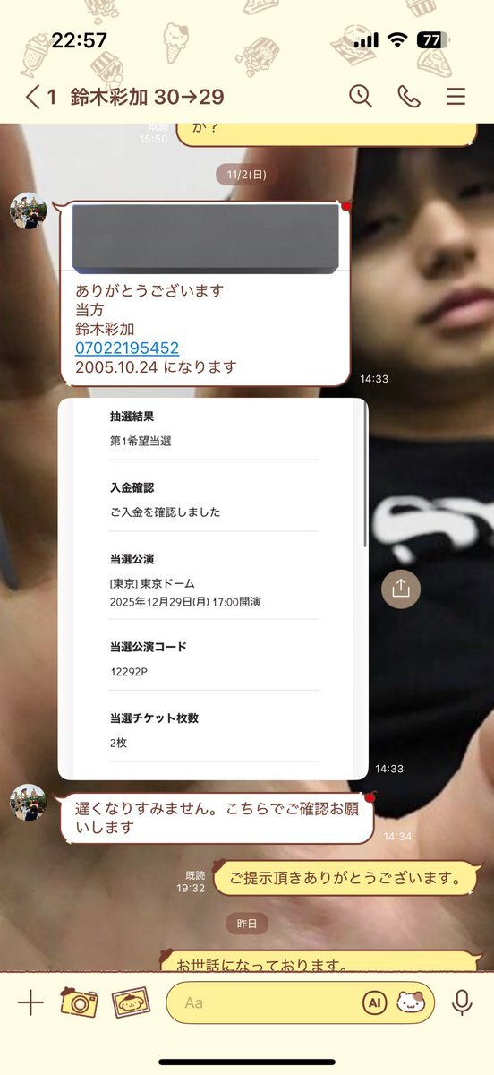 【⚠️注意喚起⚠️】 @Chinen_COCO1130 Hey! Say! JUMP DOME TOUR 東京12/29を交換同行の予定でしたが、LINE・個人情報開示後に音信不通になられた為、お気をつけください。個人情報交換後のため注意喚起いたします。 #拡散希望 pic.x.com/xkoqV64zng