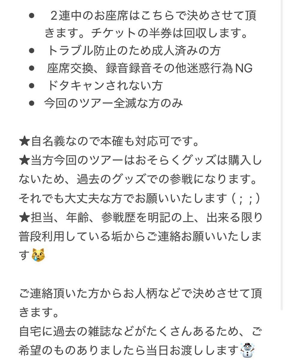 返信先:@HSJ_inomiho初めまして、検索より失礼いたします。 東京12/30のチケットを切実に求めており、当方所持の大阪1/10(重複なし)のチケットと交換同行していただきたくご連絡させていただきました。たくさんの連絡が来ていることと存じますがご検討いただけますと幸いです。よろしくお願いいたします。(25歳 山田担)