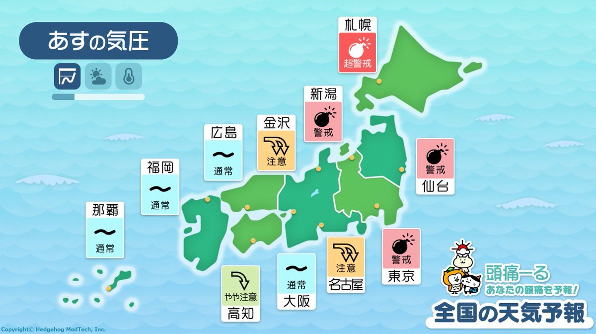 12/8(月)の天気頭痛予報: zutool.jp/column/forecas… 北日本・東日本は気圧低下⇒上昇 無理せず安静に (天気傾向) 北日本を前線を伴った低気圧が通過し、通過後は寒気が流入して冬型の気圧配置となる見込みです。