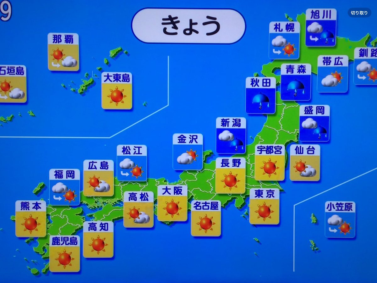 おはようございます😃 西日本ー東北南部は概ね晴れ☀️や曇り☁️ 北陸ー北日本は雨☔や曇り☁️ 気温は昨日より上がります⤴️が 朝昼の寒暖差に注意👍 インフルエンザ予防対策忘れずに👍 日曜日、今日も笑顔で元気に頑張りましょう💪 pic.x.com/ZZSLy9v1Yd