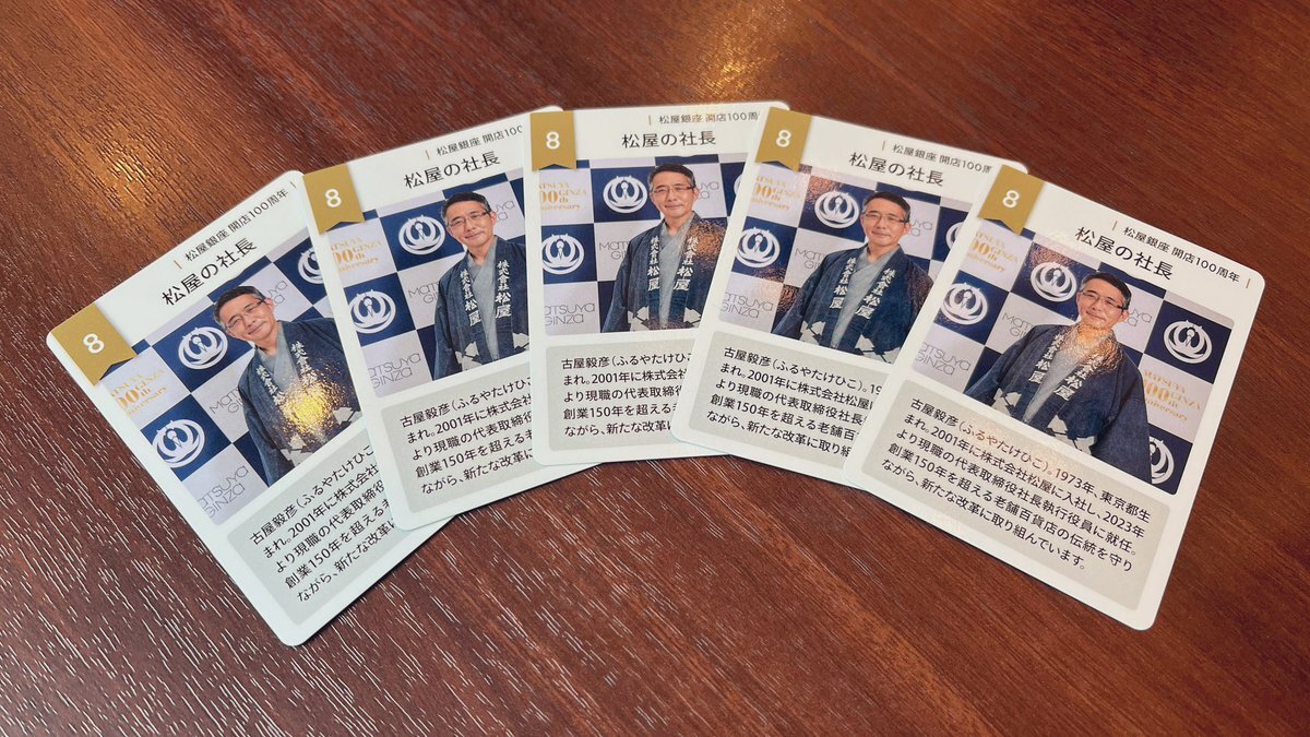 いつもお世話になっている松屋百貨店銀座本店が、今年開店100周年ということで、本日より松縁祭(しょうえんさい)を開催しておられます。 松屋銀座ガチ勢の弊社社員が早速、松縁祭で配布されるトレーディングカードを集めてまいりました。 古屋社長への愛が止まりません💕 pic.x.com/NdKBD4EuTM