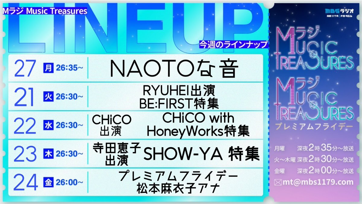 #MBSラジオ🦁MusicTreasures/ 🎧28(火) #RYUHEI 出演🐉#BEFIRST 特集 🎧29(水)#CHiCO 出演 CHiCO with #HoneyWorks 特集 🎧30(木)#寺田恵子 出演 #SHOWYA 特集 🎧31(金) プレミアムフライデー #米米CLUB 特集 松本麻衣子アナが #ReoNa にインタビュー コメントゲスト🦁#シユイ #ミュートレ pic.x.com/YEkTMiOMBD