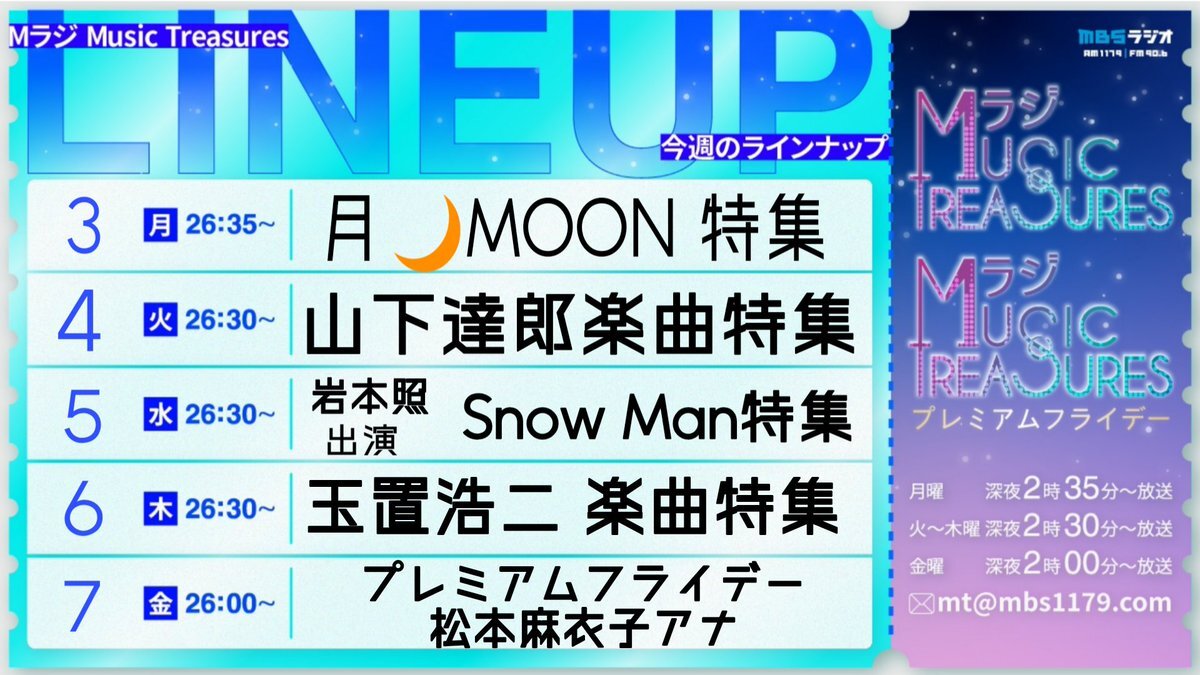 #MBSラジオ🦁MusicTreasures/ 🎧3日(月㊗) 🌙月ーMOONー特集 🎧4(火) #山下達郎 楽曲特集 🎧5(水) 💛#岩本照 出演⛄#SnowMan 特集 🎧6(木) #玉置浩二 楽曲特集 🎧7(金) 松本麻衣子アナのプレミアムフライデー #CHARA 楽曲特集 コメントゲスト🦁#尾崎裕哉 #ミュートレ pic.x.com/IeLmLbrFAs