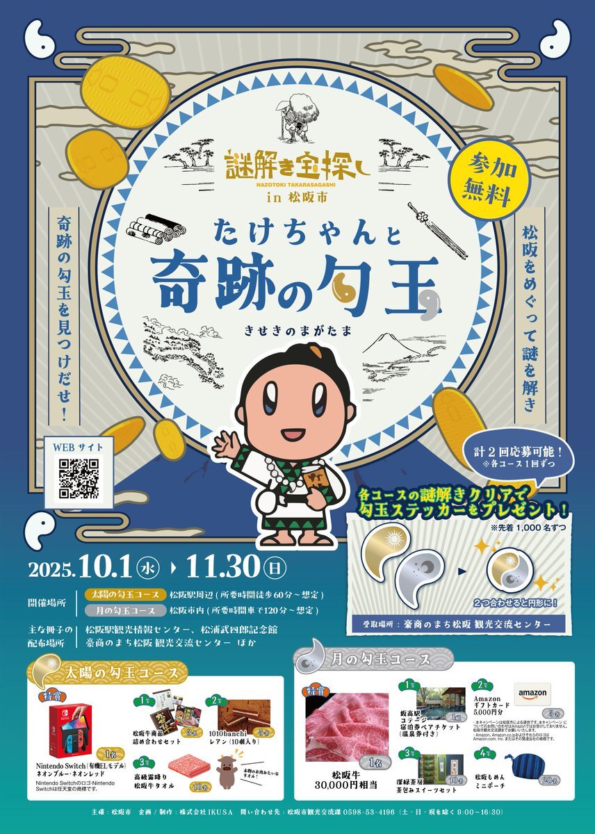 10月から開始✨ 謎解き宝探しin松阪市 〜たけちゃんと奇跡の勾玉〜 松阪のまちを歩きながら謎解きに挑戦❣クリアすると先着でプレゼント🎁さらにアンケート回答で松阪牛などの豪華賞品が抽選で当たります🎯 "謎解き冊子"の提示で松浦武四郎記念館などの施設に割引入館も👀 sengokutakara.com/matsusaka/ pic.x.com/gZ4rmntHN0