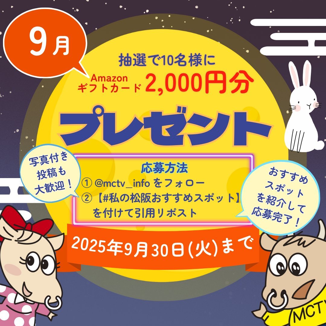 📣#プレゼント企画 開催📣 抽選で10名様にAmazonギフトカード2,000円分🎁をプレゼント✨ ⬇️応募方法⬇️ ①@mctv_info をフォロー ②このポストを【#私の松阪おすすめスポット 】を付けて引用リポスト 当選者様には後日DMでご連絡いたします! 以下を確認の上ご応募ください▼ mctv.jp/info/news/2025…