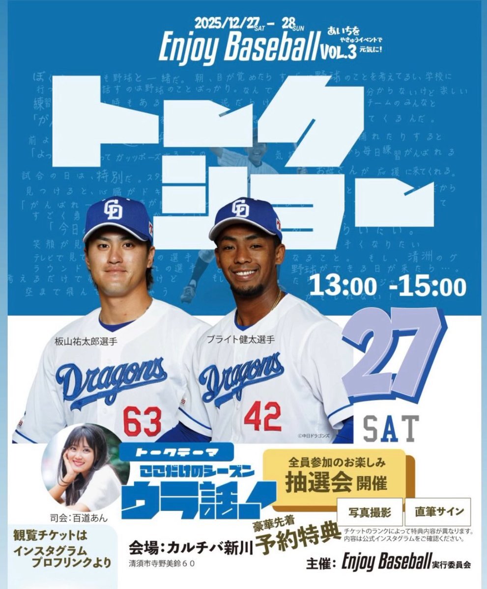 🔥11/24(月)10:00発売開始🔥 12/27(土)板山祐太郎選手・ブライト健太選手をゲストにお招きしてトークショーを開催します!✨ 熱く笑顔になれる時間をお約束します♪ #dragons #中日ドラゴンズ #板山祐太郎 選手 #ブライト健太 選手 最新情報はこちらをチェック! instagram.com/enjoybaseball_… pic.x.com/3RgmJiX0Sc