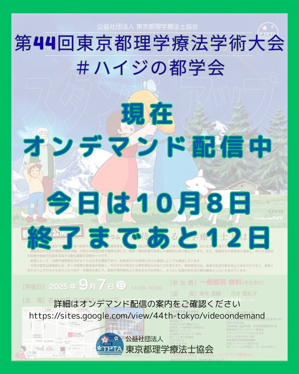 #第44回東京都理学療法学術大会 #ハイジの都学会 みなさま、現在オンデマンド配信中です!今日は10月8日! 配信期間は10月20日17時まで、あと12日!2週間を切っております! 🔻「オンデマンド配信の案内」はこちら🔻 sites.google.com/view/44th-toky… #東京都理学療法士協会