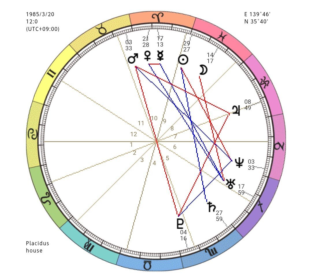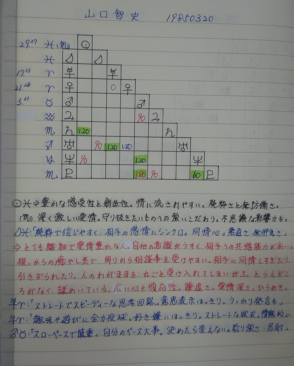 →続き 山口智史(さとし)さん。 火星木星冥王星の赤い三角形は、なんかこわい感じ。エネルギーの使い方に気を付けないといけない、みたいな。 青い線は『革命的な思考。願いを形にする力』だそう。 太陽も月も魚座の似た人に、桜井和寿さん、佐野元春さん、柳沢慎吾さんも。 ↓続く pic.x.com/VvClIjX5OA