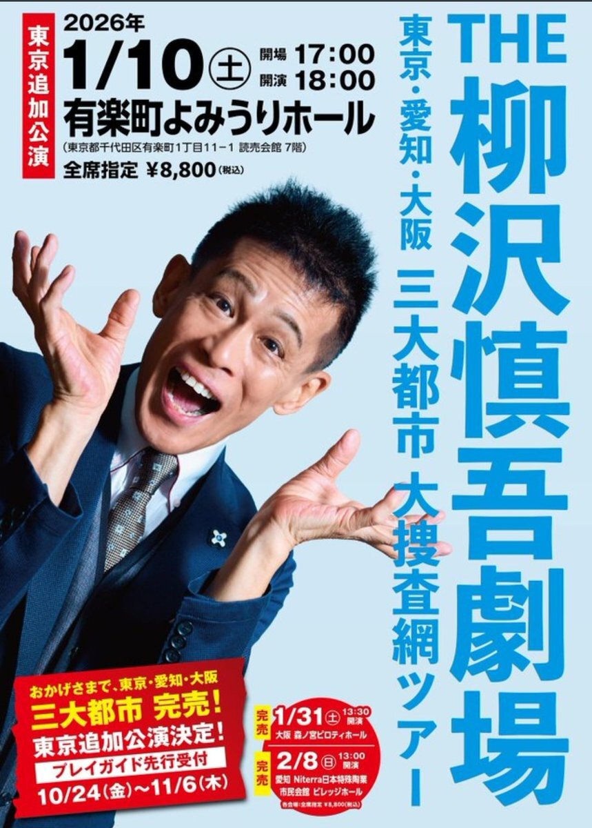 \好評!チケット一般発売中/ 📢『THE 柳沢慎吾劇場』 東京・愛知・大阪 三大都市 大捜査網ツアー 📅1/31(土)📍森ノ宮ピロティホール 📅2/8(日)📍Niterra日本特殊陶業市民会館ビレッジホール チケット購入はこちら👇 cnplayguide.com/shingoyanagisa… #柳沢慎吾劇場