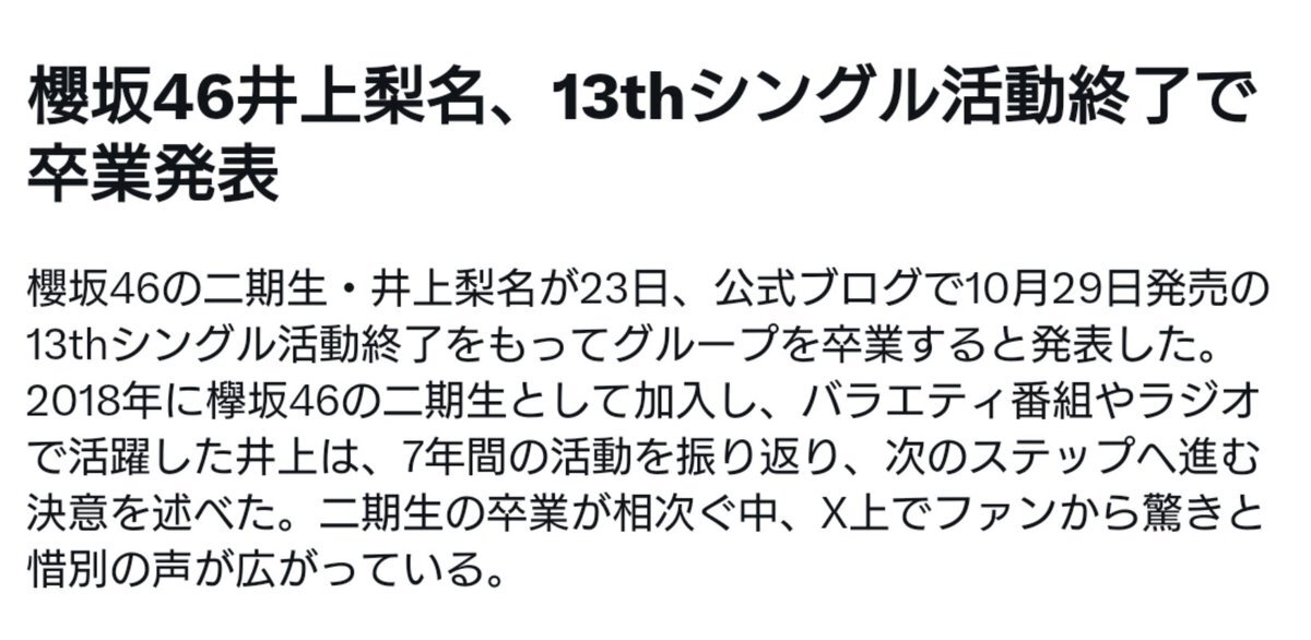 櫻坂46は いのり こと井上梨名さんが卒業発表したけど、卒業記念の井上梨名1st写真集は出すのかな。齋藤冬優花さんと上村莉菜さんがなかったから同じかな。Buddies界隈で田村保乃だと思ってたと言われてるけど、皆年齢ベースで考えてるか。田村さんは梅澤美波さんと、乃木坂の田村真佑さんとも同学年か pic.x.com/VvfuWJeaHJ