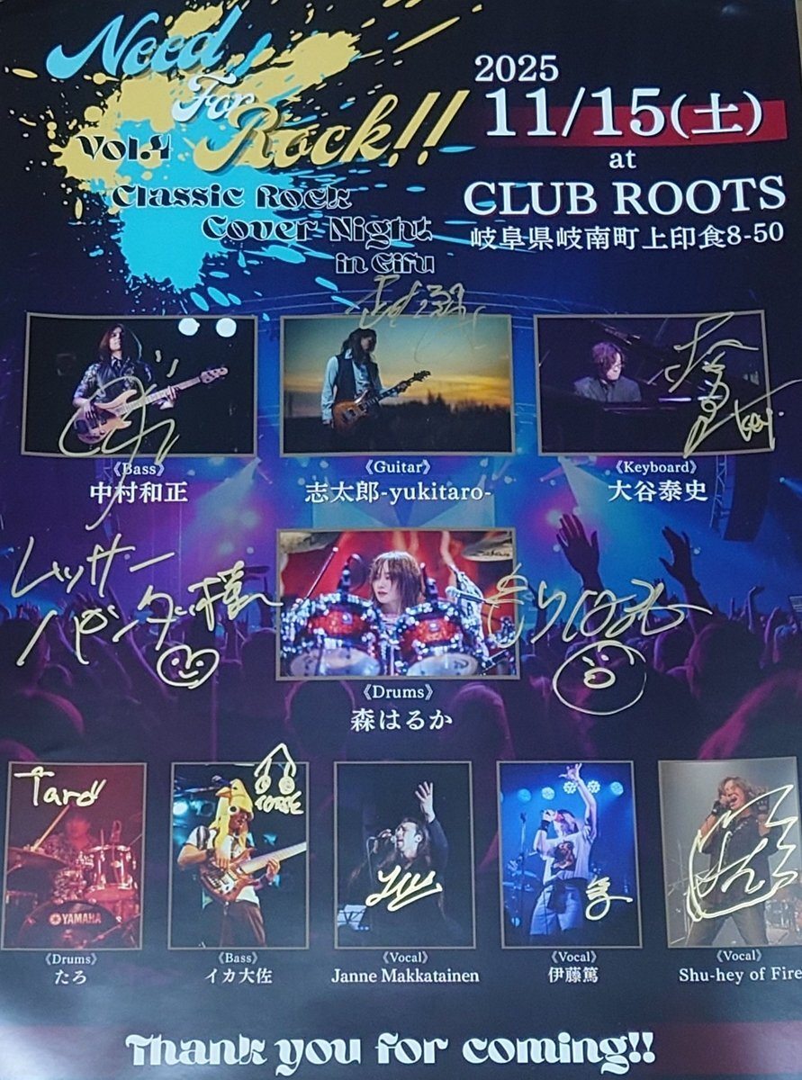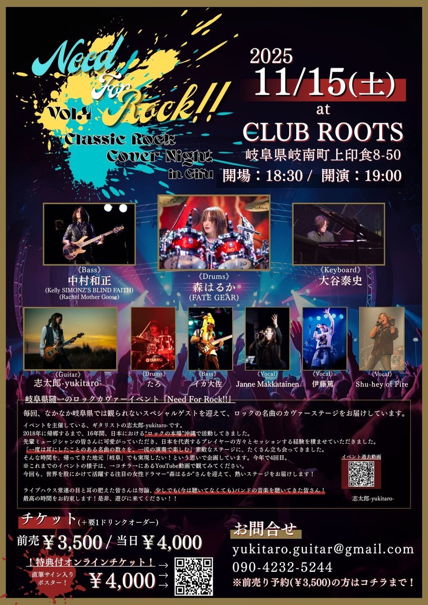 11/15(土) 岐阜CLUB ROOTS 『Need For Rock!! Vol.4』  森はるか(D) /志太郎-yukitaro-(G) / 中村和正(B)/大谷泰史(Key) / Janne Makkatainen(V) / 伊藤篤(V) / 修平(V) / たろ(D) / イカ大佐(B) OPEN18:30 START19:00 前売¥3000(D別) 特典付きオンラインチケット¥4000 yukitaro.buyshop.jp/items/119185206 pic.x.com/z0AA5ymv7g