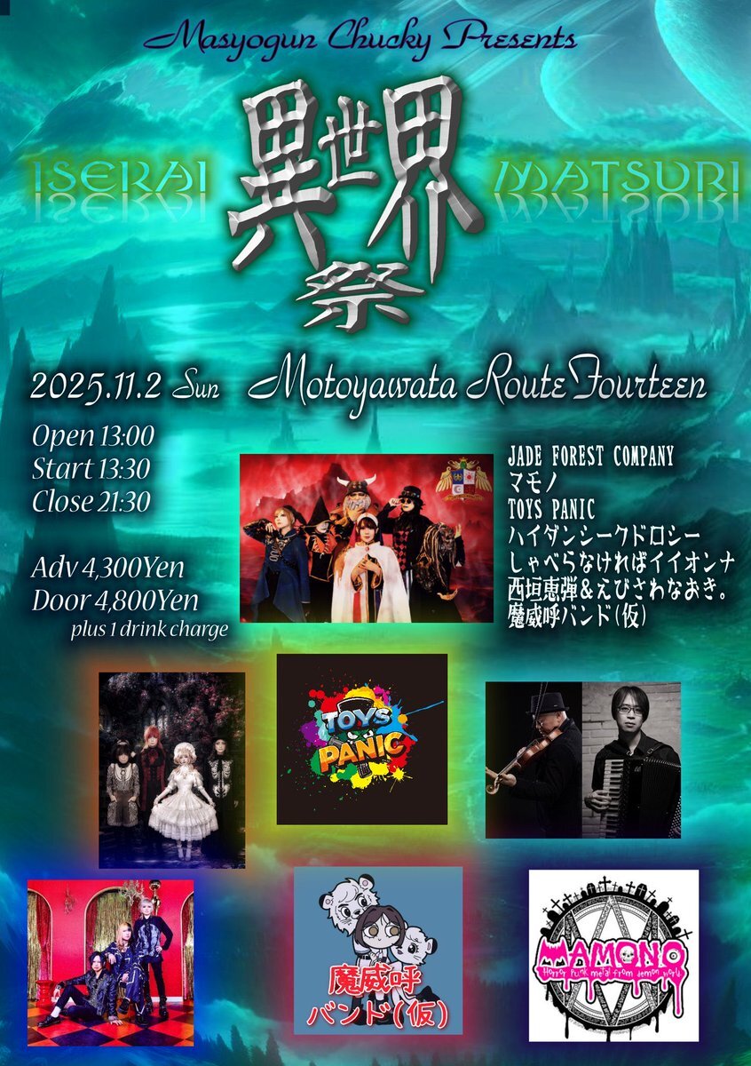 ✨異世界祭タイムテーブル発表✨ 11月2日(日) 本八幡ROUTE FOURTEEN 出演 JADE FOREST COMPANY マモノ TOYS PANIC ハイダンシークドロシー しゃべらなければイイオンナ 西垣恵弾&えびさわなおき。 魔威呼バンド (Gt Sena(yesAND),Ba Y.O.U.子,Dr 森はるか) ◆チケット◆ eplus.jp/sf/detail/4393… pic.x.com/kWudJUbhb6