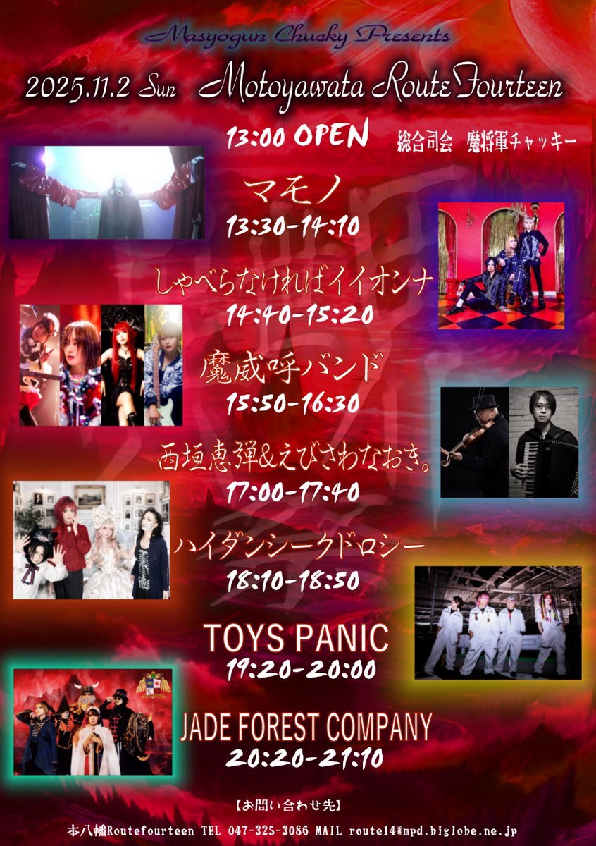 ✨遂に来週✨ 11月2日(日)本八幡ROUTE FOURTEEN 「異世界祭」 Op13:00 St13:30 JADE FOREST COMPANY マモノ TOYS PANIC ハイダンシークドロシー しゃべらなければイイオンナ 西垣恵弾&えびさわなおき。 魔威呼バンド (Gt Sena,Ba Y.O.U.子,Dr 森はるか) ◆チケット◆ eplus.jp/sf/detail/4393…