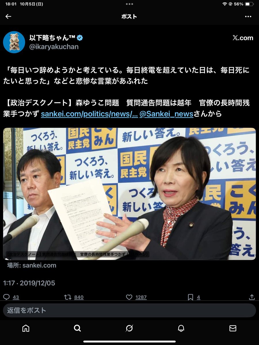 高市さんは自分がワークライフバランスを捨てて働く、と言ってますが。 立憲民主党さんは質問の提出期限を守れないので、官僚に迷惑をかけながらワークライフバランスを捨てているようです。立憲民主党の議員が高市氏のワークライフバランス発言を批判してたのでつい思い出してしまいました。