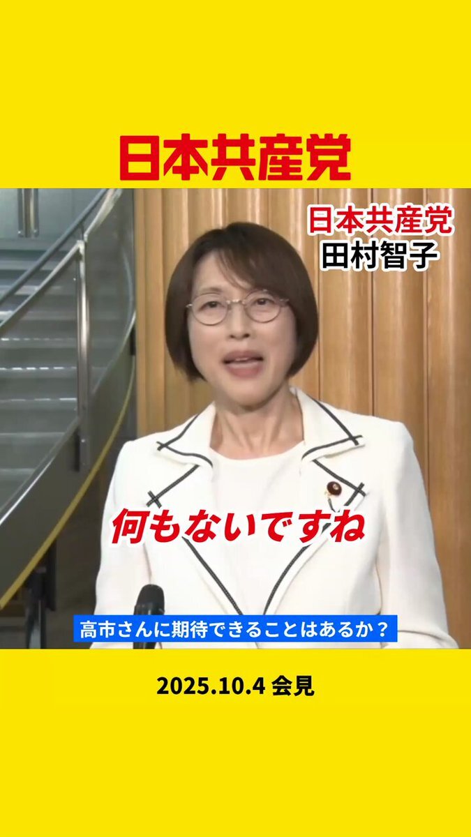 記者:高市さんに期待できることはあるか? 田村委員長:何もないですね。自民党政治を終わらせていく以外に、このゆきづまった状況を打開することはできない。 2025.10.4 #日本共産党 #田村智子 会見