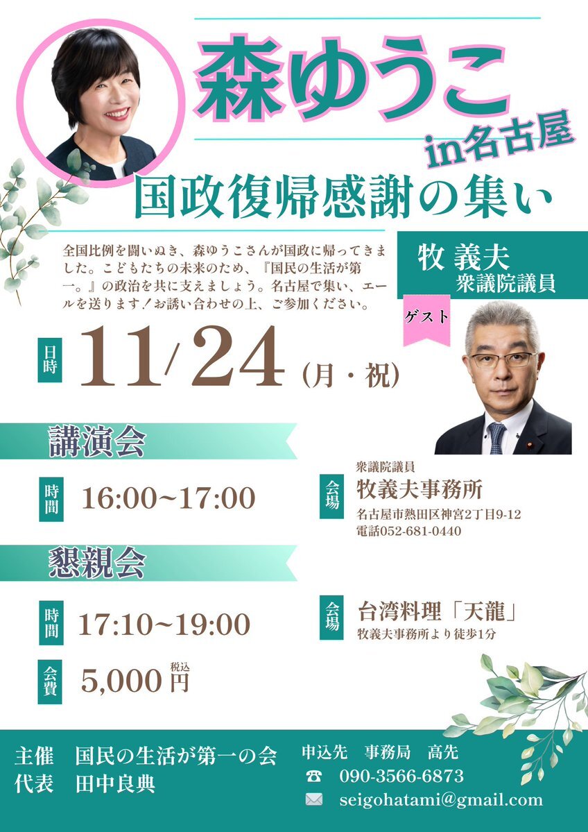 11月24日(月・祝)参議院議員森ゆうこ「国政復帰 感謝の集い」を開催します。 全国比例を闘い抜いて国政に戻られた森ゆうこ参議院議員の思いを、直接聞ける貴重な機会です。 牧義夫衆議院議員もゲストとして参加予定です。 講演会と懇親会をご用意していますが、講演会のみの参加でも大歓迎です。 pic.x.com/cGXceK5Lzt
