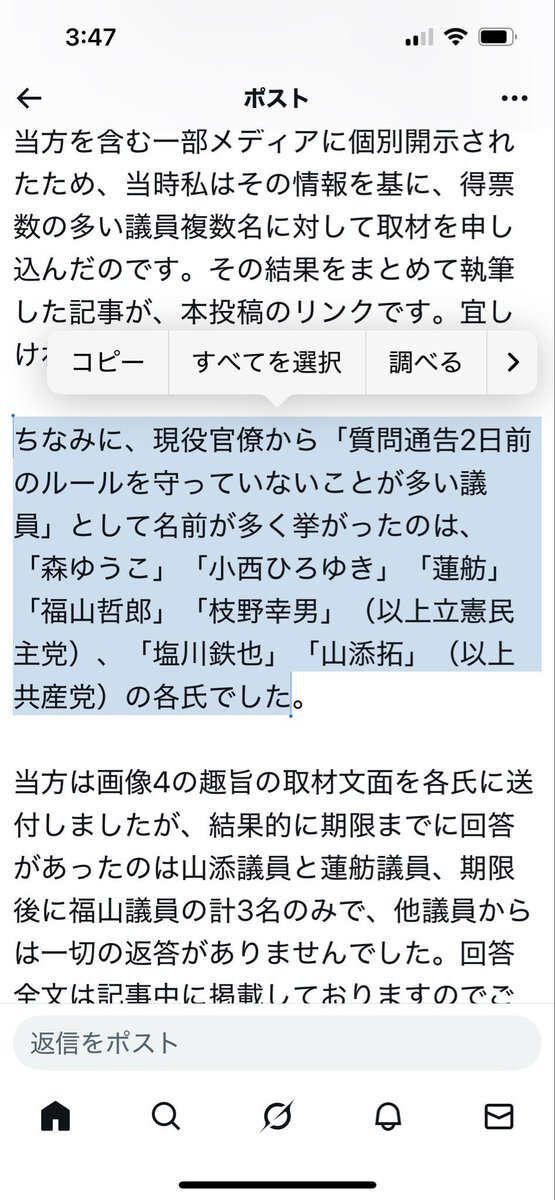 返信先:@yamazoejimusyo他1人山添さん 取材へ回答されましたでしょうか? 現役官僚から「質問通告2日前のルールを守っていないことが多い議員」として名前が多く挙がったのは、「森ゆうこ」「小西ひろゆき」「蓮舫」「福山哲郎」「枝野幸男」(以上立憲民主党)、「塩川鉄也」「山添拓」(以上共産党)の各氏でした pic.x.com/zD4M17vZ7Z x.com/sxzbst/status/…