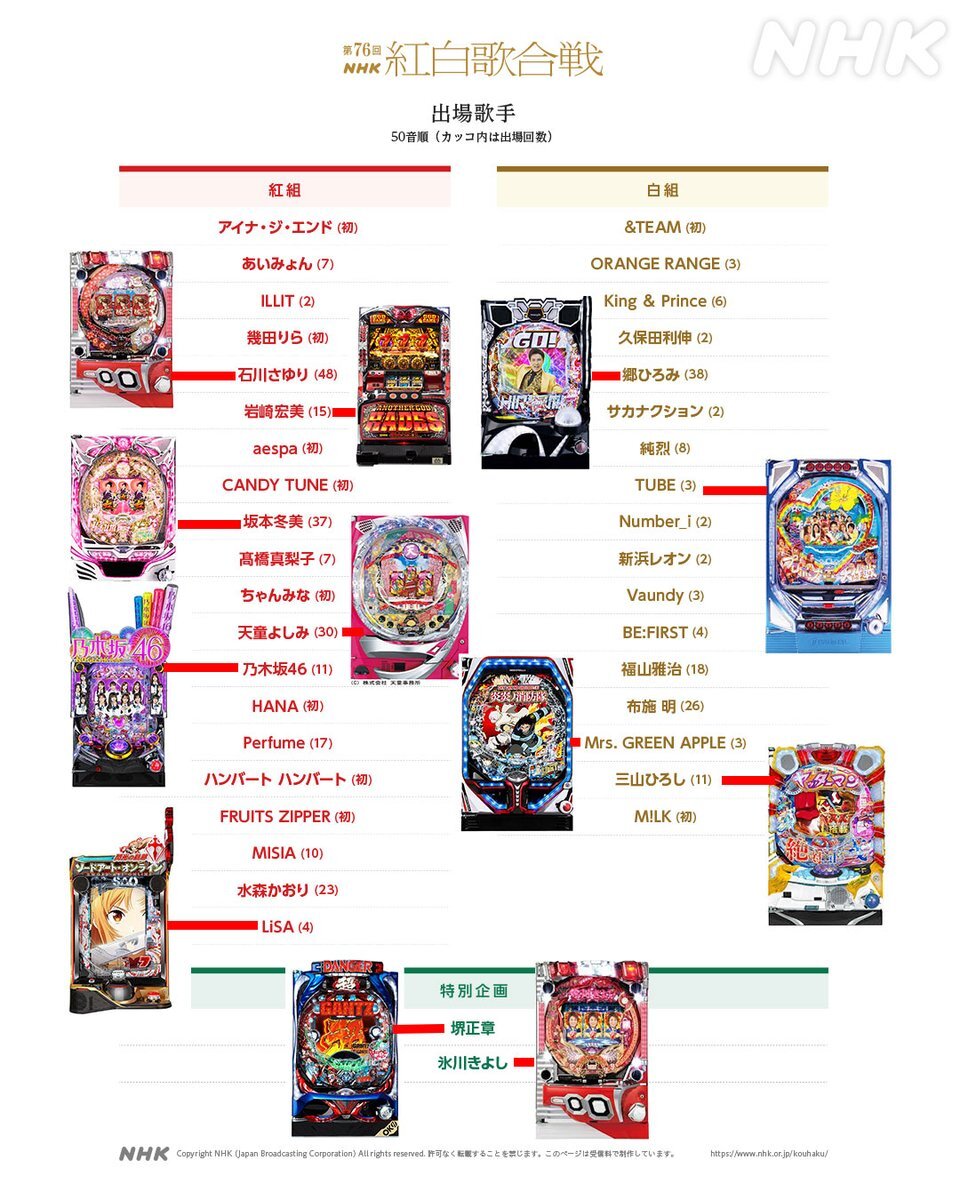 紅白歌合戦の出場者が発表されましたね。 やはり京楽と大一が強いか。 ニューギン枠は天童よしみと郷さんのみ。 小林幸子、森進一、シード林檎など 常連アーティストがいないのがなぁ。 pic.x.com/nbO1mEZdoM